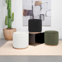 Minimal and playful, this modern ottoman offers extra seating in a contemporary style home. Wrapped in a faux sheep skin upholstery in a beige hue, it offers a bright mood that cheers up any space. Supported by slim rod-like metal legs in a matte black, this round chunky ottoman is contrasted in both color and shape. Perfect for a boho-inspired living room, this ottoman lends an earthy, natural vibe effortlessly. Use it to offer extra guest seating or to kick up your feet in front of an accent chair.