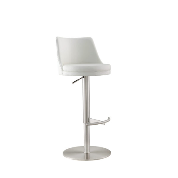 T1 Barstool is crafted with a High quality Stainless Steel Frame and Footrest for Sturdy, Structural Integrity Support. Upholstered in Plush, luxurious Eco Leather. The Seat Cushions and Backs are created for Optimal Comfort. It features a Gas Lift Adjustable Height Seat with Full Swivel Seat Capability. Color: White